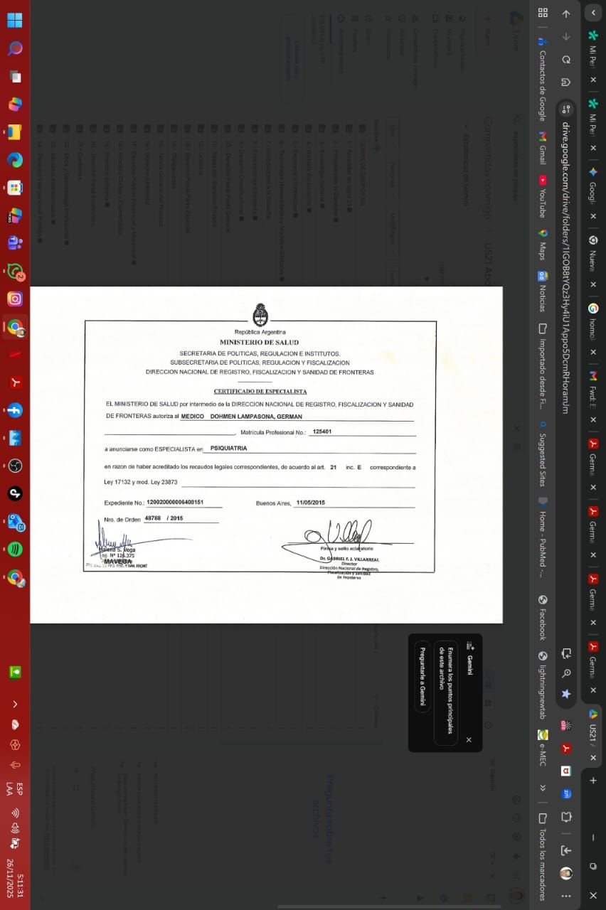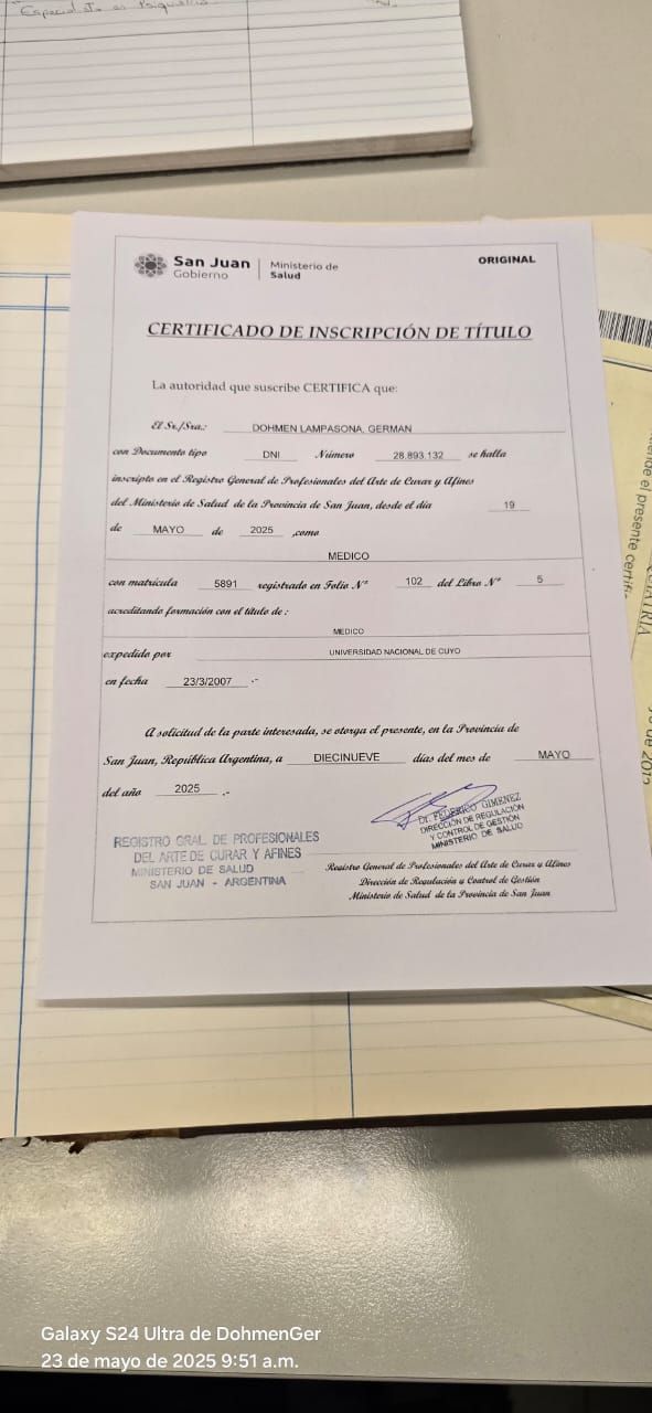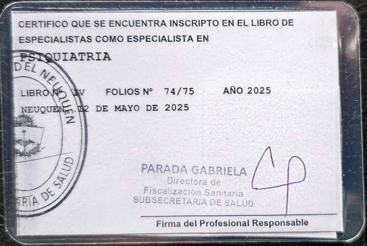 Gracias a mis credenciales profesionales activas en múltiples jurisdicciones (Ministerio de Salud de la Nación - CABA, Mendoza, San Juan y Neuquén), ofrezco telemedicina segura y validada para pacientes en cualquier provincia de argentina. mi consultorio virtual es un espacio estructurado, confidencial y cómodo.