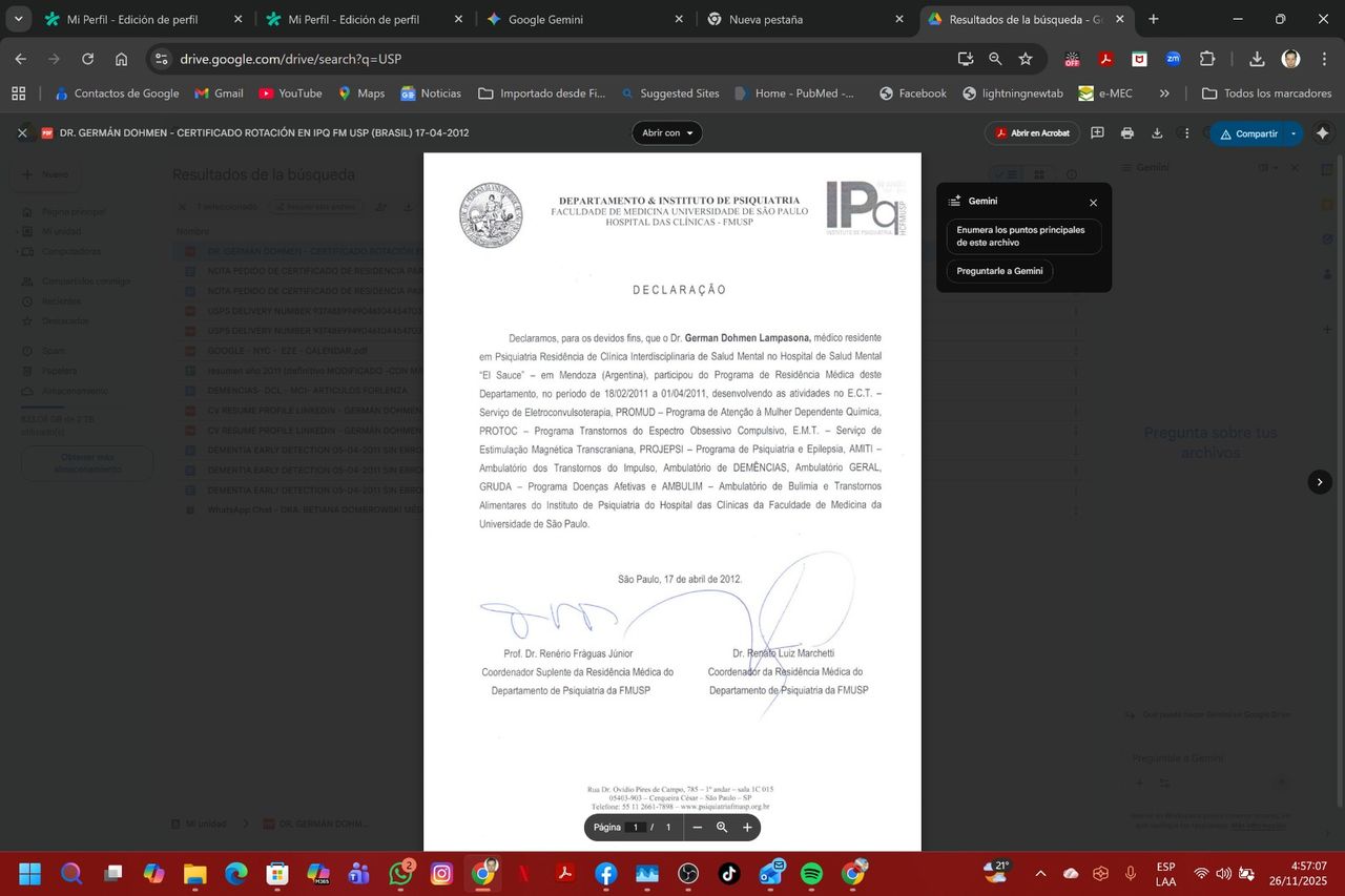 Mi formación incluye un sólido entrenamiento internacional: realicé pasantías en el Instituto de Psiquiatría, Hospital das Clínicas, de la Universidade de São Paulo (IPq-HC-FMUSP) en Brasil, enfocándome en áreas de alta complejidad como demencias, adicciones y trastornos afectivos. Además, mi título de licenciado en medicina fue homologado en España, lo que me proporciona una perspectiva global de la medicina y la psiquiatría.